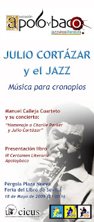 FERIA DEL LIBRO 2009 - Sevilla, del 14 al 24 de Mayo de 2009 - La Feria del Libro de Sevilla 2009, que se celebrará del jueves 14 al domingo 24 de mayo, estará dedicada al futuro del libro y por primera vez, contará con casetas en la Plaza de San Francisco además de en la Plaza Nueva. Junto a las novedades, la Feria del Libro no dejará de lado sus actividades más habituales. Así, como ya es tradicional, una figura literaria de prestigio será la encargada de inaugurar esta cita anual con la lectura. En esta ocasión, el elegido es el escritor y filósofo Fernando Savater (San Sebastián, 1947). Reciente Premio Planeta 2008, Savater ha publicado más de cincuenta obras de ensayo político, literario y filosófico, pero también narraciones y obras de teatro, además de numerosos artículos en la prensa española y extranjera. Igualmente, la Feria recupera la dedicatoria de la edición de 2008, ‘Culturas del mediterráneo’, para convertirla en un ciclo de más largo recorrido, al igual que ocurrió y seguirá ocurriendo este año con ‘Sevilla capital de la poesía’, tema al que se dedicó la Feria en 2006 y que desde entonces se ha convertido en uno de las principales citas de este encuentro con las letras que tiene lugar en Sevilla cada primavera. Uno de los autores recordados en esta Feria del Libro será Julio Cortazar - de cuya muerte se cumplen 25 años-, al que se dedicarán varias actividades organizadas por el Centro de Iniciativas Culturales de la Universidad de Sevilla (Cicus) y por la Asociación Apoloybaco. LA ASOCIACION APOLOYBACO PARTICIPARÁ POR SEGUNDO AÑO CONSECUTIVO EN LAS ACTIVIDADES CULTURALES DE LA FERIA DEL LIBRO DE SEVILLAACTIVIDADES DE LA ASOCIACION APOLOYBACO EN LA FERIA DEL LIBRO - LUNES 18 DE MAYO EN LA PÉRGOLA DE PLAZA NUEVA - 21:00 HORAS - 1ª Parte - PRESENTACIÓN DEL LIBRO CON LOS AUTORES FINALISTAS DEL III CERTAMEN LITERARIO APOLOYBACO - Presenta: Luis Miguel León Blanco (sección literatura Apoloybaco) - Intervendrán: Nerea Riesco, escritora, Francisco Vélez Nieto, poeta y Presidente AFLS - 2ª Parte - La Asociación Apoloybaco, en colaboración con el Centro de Iniciativas Culturales de la Universidad de Sevilla (CICUS), organizan el concierto de: Manuel Calleja Cuarteto: Homenaje a Charlie Parker y Julio Cortázar.